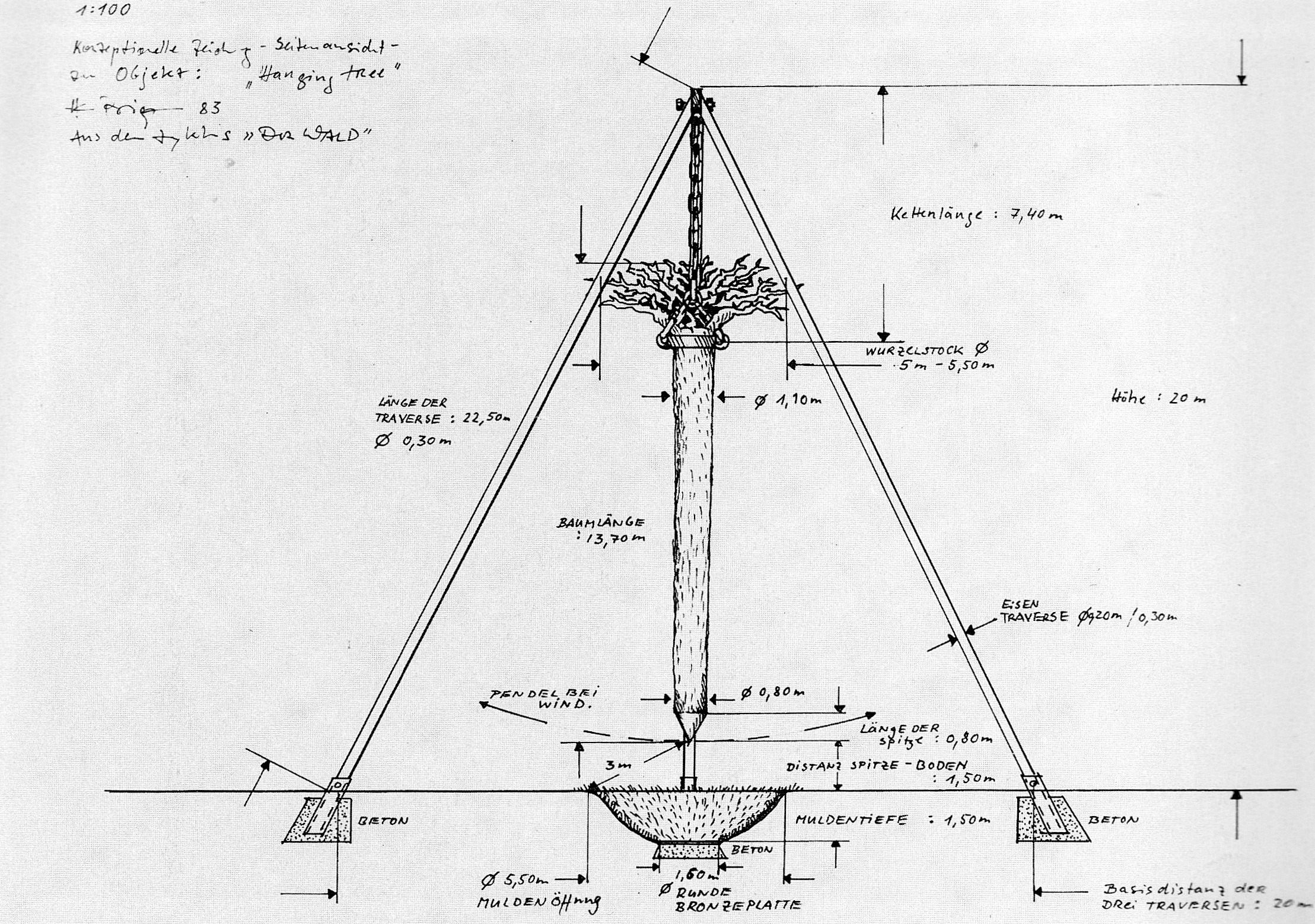 The object: steel tripod, 23.6 meters tall – tree (larch), 16.5 meters long – hollow, 20 meters wide – granite block, 1.80 x 1.80 meters in size.